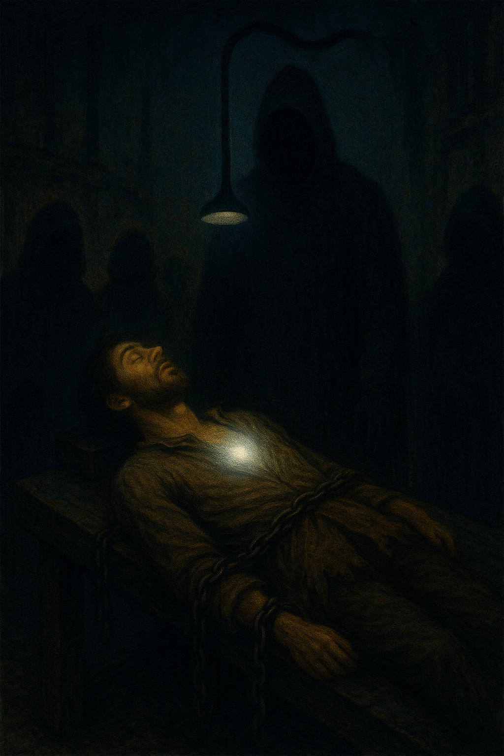 Wrested to a table, my chains unloosed, Lifted by smoke, belly-up, bruised I opened my fist; the key was gone The chains pulled tight, through iron hoops No lute nor sack across my back— The tube came low, above my chest