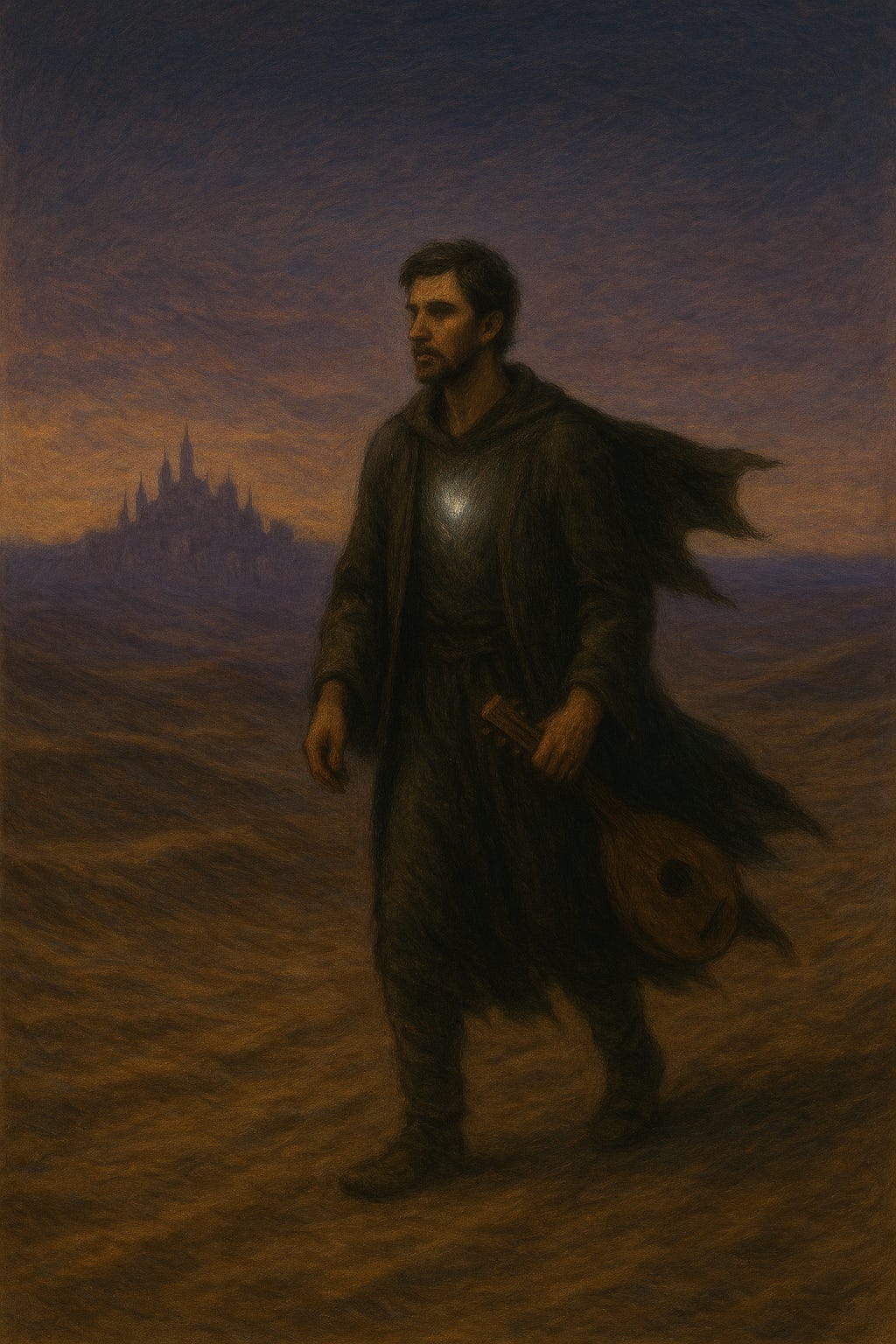 Heading from the lights, city shrinking behind, I carry my light into beckoning night and I wander A smile on my lips as always on such trips The stars all glitter with me, There was no key clutched in my fist. That gift was me. There were never shackles on my wrists— Never chains across my back— Never a collar ‘round my neck, But a necklace and a strap, holding a lute in a leather sack